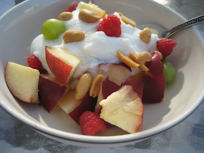 white peaches, grapes, plain yogurt and peanuts.
