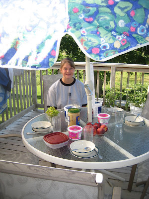 You don’t have to have a pretty umbrella and table. A blanket on the grass does great too. Use a laundry basket or a big tray to save steps when transporting food and dishes outside. One unexpected benefit: spills are no stress outdoors.