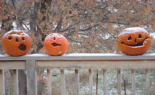 The first snow makes my kids estatic, but I will miss the flowers, and the gorgeous gold and red leaves. I left some strangers out in the cold accidentally, and that first snow took us all by surprise! I always want to make our jack o’ lanterns into pumpkin bread, and these were patiently waiting, but the snow came first—their faces even look startled, don’t they?!