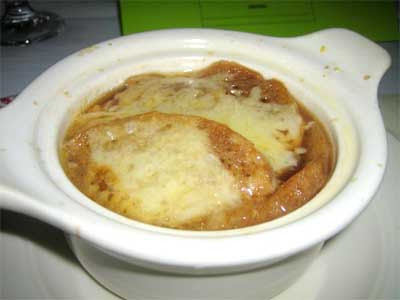 Arrange thick slices of crusty bread on a cookie sheet. Top with a slice of cheese and broil until melted and bubbly. Scoop soup into bowls and float cheesy bread on top just before serving. Serves 6.