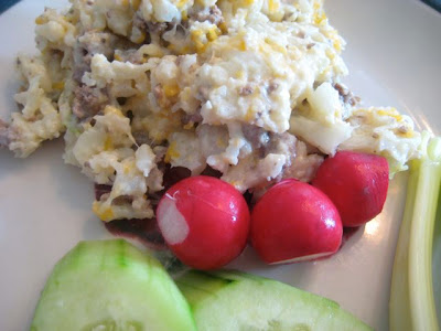 Mix in a serving bowl or casserole dish: mustard, mayonnaise, salt, and grated cheese. (I like to use the horseradish-type mustard!) Add cauliflower to bowl and mash with a potato masher until cauliflower is crumbled.